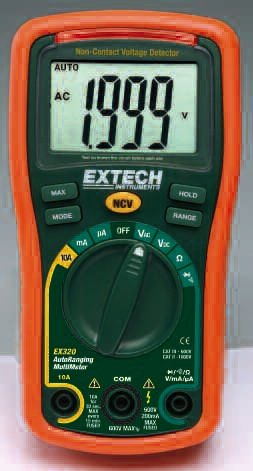 Eight Functions in One Affordable PackageThe EX411 offers mulitple functions so you can carry one meter into the field instead of several. The manual-ranging EX411 measures AC/DC voltage, AC/DC current, resistance, diode, and continuity, all with +/-0.5 percent basic accuracy. The unit has low current capability, measuring down to 0.1uA, and features input fuse protection and mis-connection warnings. A Type K thermometer is built in for surface or air temperature measurements.